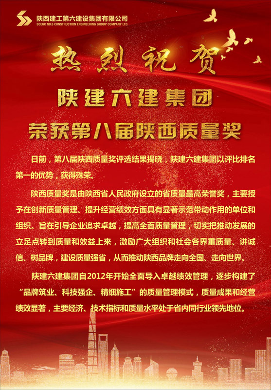 喜報(bào):陜建六建集團(tuán)榮獲第八屆陜西質(zhì)量獎(jiǎng)
