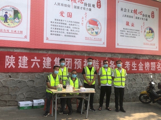在渭城中學(xué)考點(diǎn),六建集團(tuán)五公司在頭一天就組織人員協(xié)助渭城中學(xué)布置外圍場(chǎng)地,搭設(shè)隔離帶,并向?qū)W校的監(jiān)考老師和工作人員捐贈(zèng)了1000只口罩和200支便攜式免洗凝膠及消毒酒精,支持學(xué)??荚嚬ぷ?。