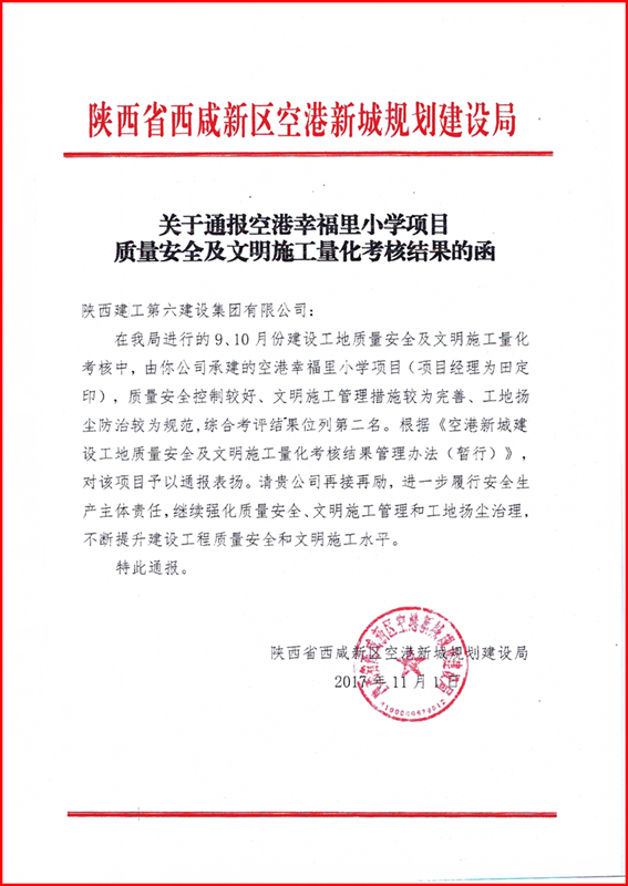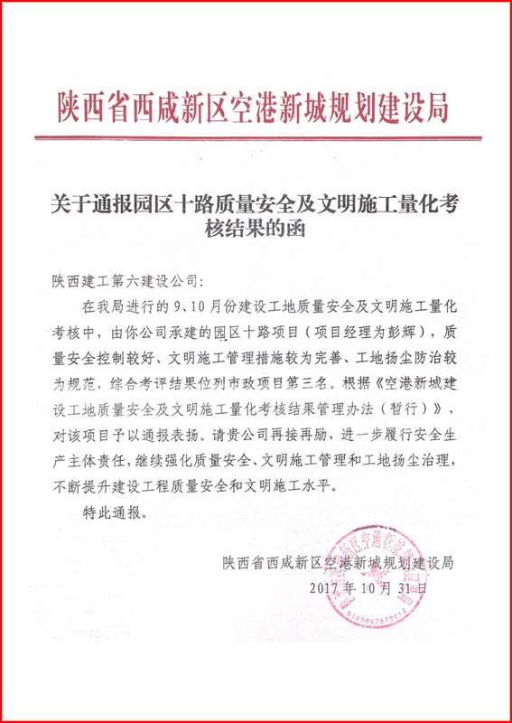 日前,在西咸新區(qū)空港新城規(guī)劃建設局開展的9,10月份建設工地質量安全及文明施工量化考核工作中,我集團承建的空港幸福里小學項目和園區(qū)十路項目因較好的質量安全控制、較為完善的文明施工管理措施和規(guī)范的揚塵防治等,綜合考評分別位列第二、三名,被空港新城規(guī)劃建設局發(fā)函通報表揚,為企業(yè)塑造了良好形象,贏得了口碑。(張瀚予)