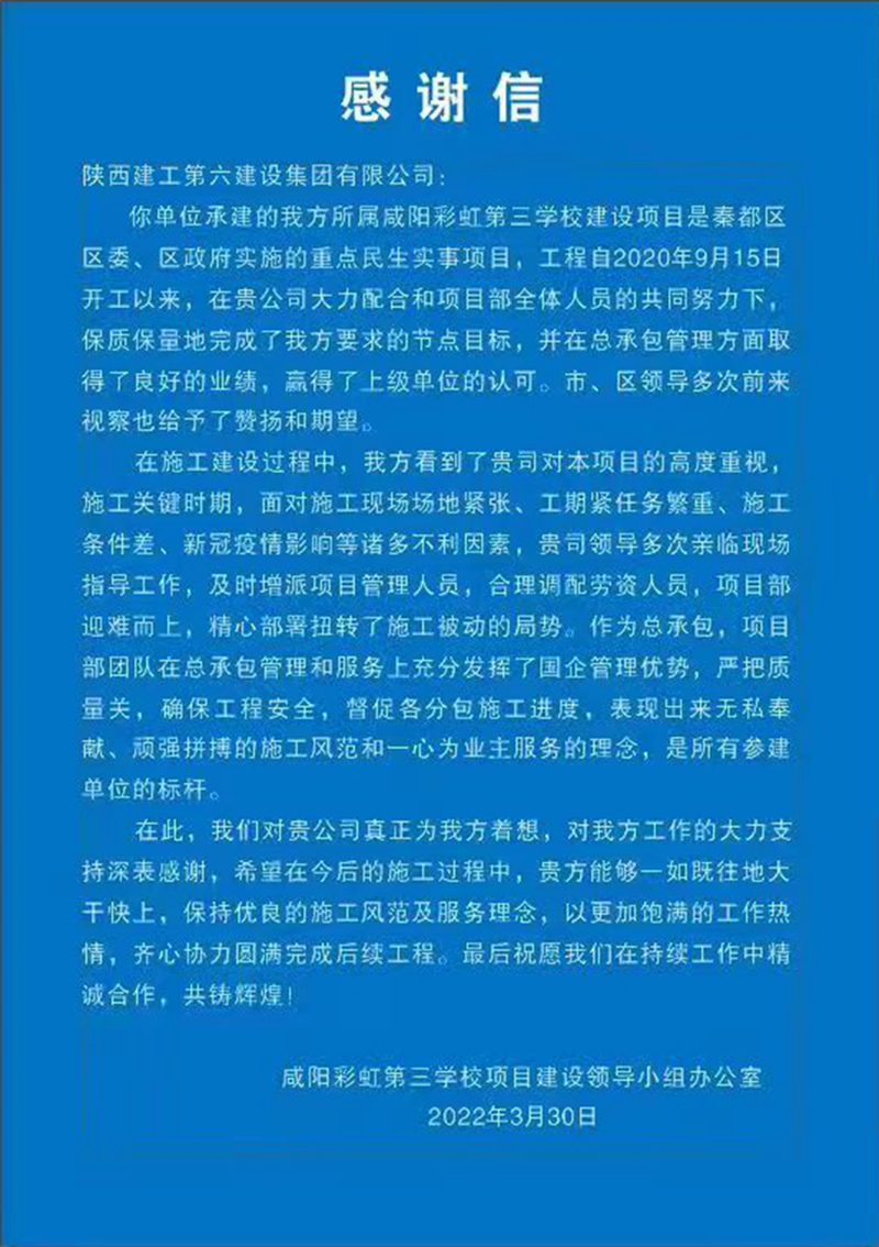日前,陜建六建集團(tuán)收到咸陽(yáng)彩虹第三學(xué)校項(xiàng)目建設(shè)單位領(lǐng)導(dǎo)送來(lái)的錦旗與感謝信,信中對(duì)六建集團(tuán)在施工過(guò)程中精心組織、科學(xué)安排,攻堅(jiān)克難保履約,圓滿完成各項(xiàng)任務(wù)表示肯定和感謝,高度贊揚(yáng)了六建團(tuán)隊(duì)施工風(fēng)范和管理水平,對(duì)項(xiàng)目團(tuán)隊(duì)的努力付出表示崇高的敬意。
